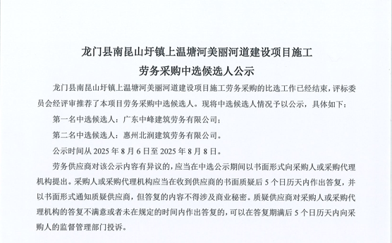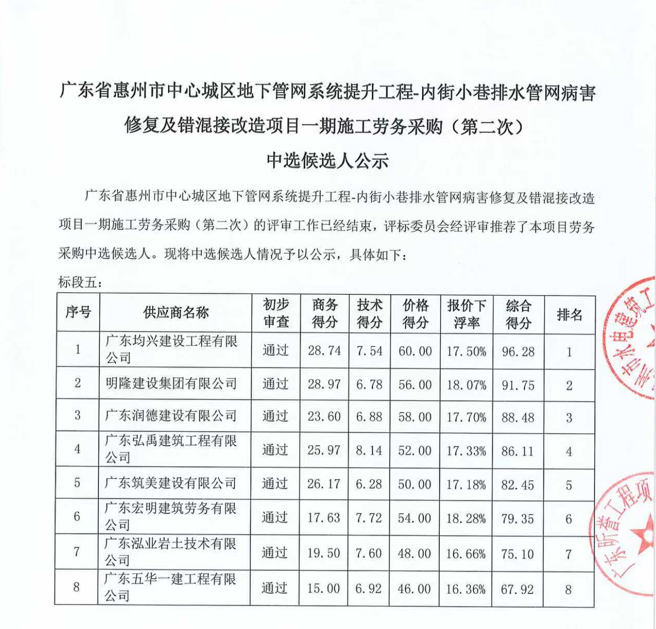 廣東省惠州市中心城區(qū)地下管網(wǎng)系統(tǒng)提升工程-內(nèi)街小巷排水管網(wǎng)病害修復及錯混接改造項目一期施工勞務(wù)采購(第二次)中選候選人公示……